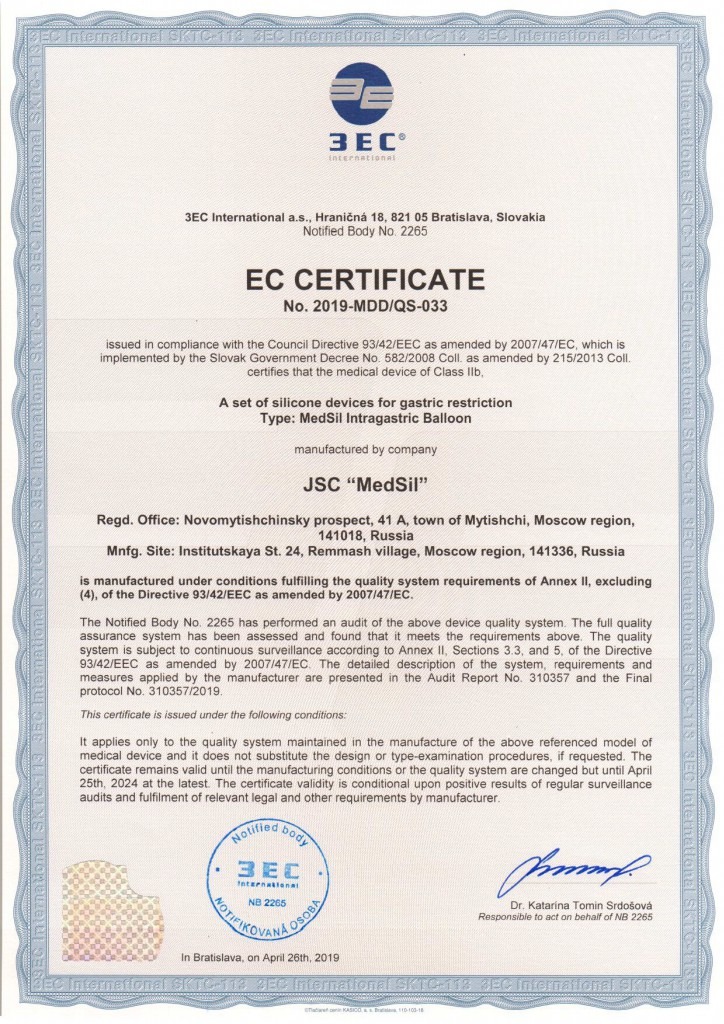 En marzo de 2017, el Organismo Notificado 3ЕС (№2265, República Eslovaca) realizó una auditoría de certificación de la fábrica. Como resultado de la auditoría, la conformidad del sistema de control de calidad de CSC “MedSil” para el diseño, desarrollo y distribución de dispositivos médicos no activos “El conjunto de dispositivos de silicona para restricción gástrica” con los requisitos de la norma internacional EN ISO 13485 :2012 fue confirmado. Los expertos del organismo notificado encontraron que el dispositivo médico "El conjunto de dispositivos de silicona para la restricción gástrica" se fabrica de acuerdo con los requisitos de la Directiva 93/42/ЕЕС. Se emitieron certificados que autorizan a “MedSil” a marcar el producto con el signo CE y distribuirlo en el territorio de la Unión Europea.